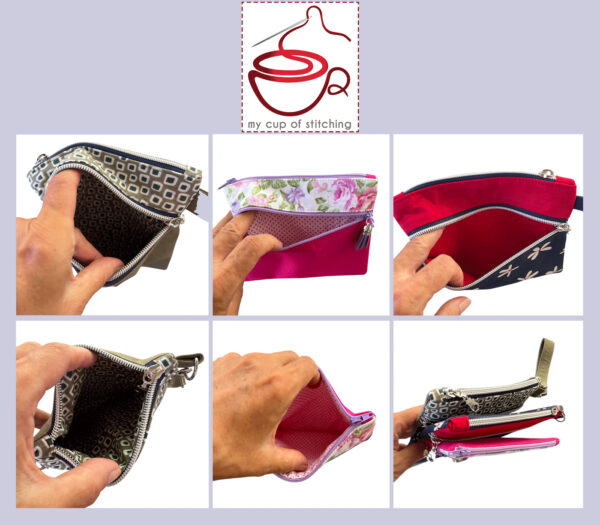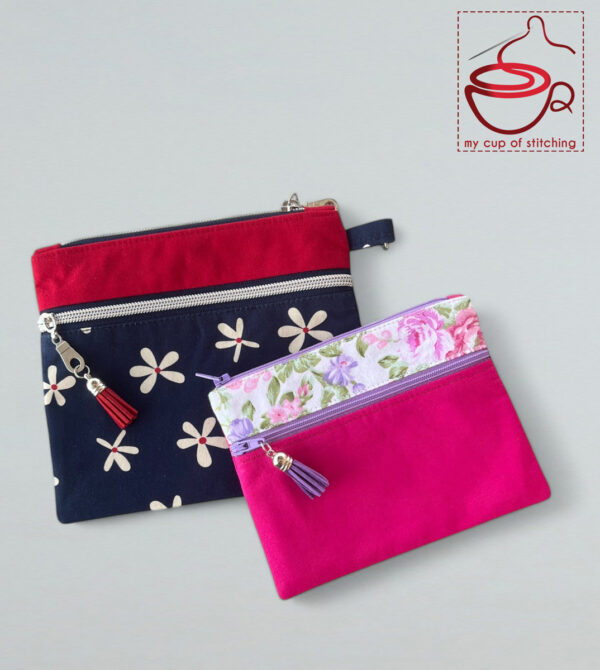 Sewing pattern for Double zipper pouches are very detailed, easy to follow, step by step, with clear sewing instructions and color photos of each step. Each pouch has it’s own explanation and tutorial.