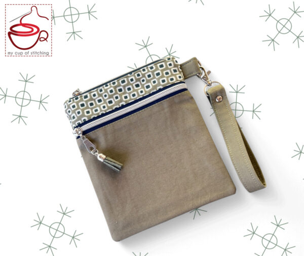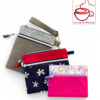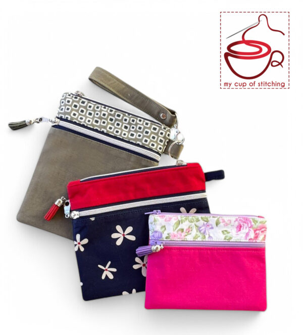 The pattern includes 3 pouch sizes, all constructed using the same basic method. However, each size has slight variations in details, such as zipper preparation, the addition of a side pull, and a no raw edge wristlet attachment.